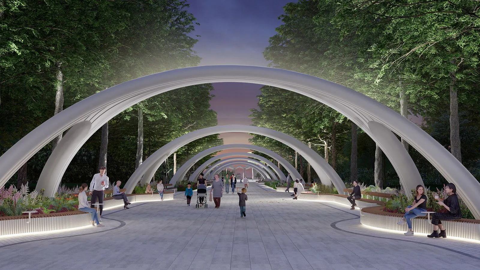 Партерная зона — от главного входа до Фестивальной площади — полностью преобразится. Ажурную колоннаду с полукруглыми арками, помещения касс и стену с афишей планируют отремонтировать. Главную аллею (от Главного входа до проезда Сокольнического круга) предлагается замостить плиткой, вдоль нее установить колонны, венчать которые будут световые элементы, а между ними разместить лавочки.